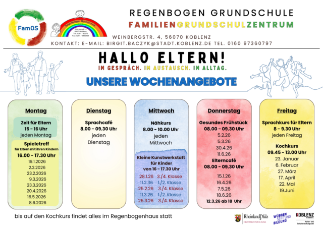 Die Regenbogen Grundschule ist seit dem 01.08.2023 Familiengrundschulzentrum. Bei uns sind alle Familien willkommen zum Austausch und zur Begegnung. Gemeinsam gestalten wir unser Schulleben und es gibt Angebote für Groß und Klein. Wir bieten unseren Familien ein vielseitiges Beratungs-, Bildungs und Freizeitangebot. Hier finden Sie den Link zur Famos Seite der Stadt Koblenz.